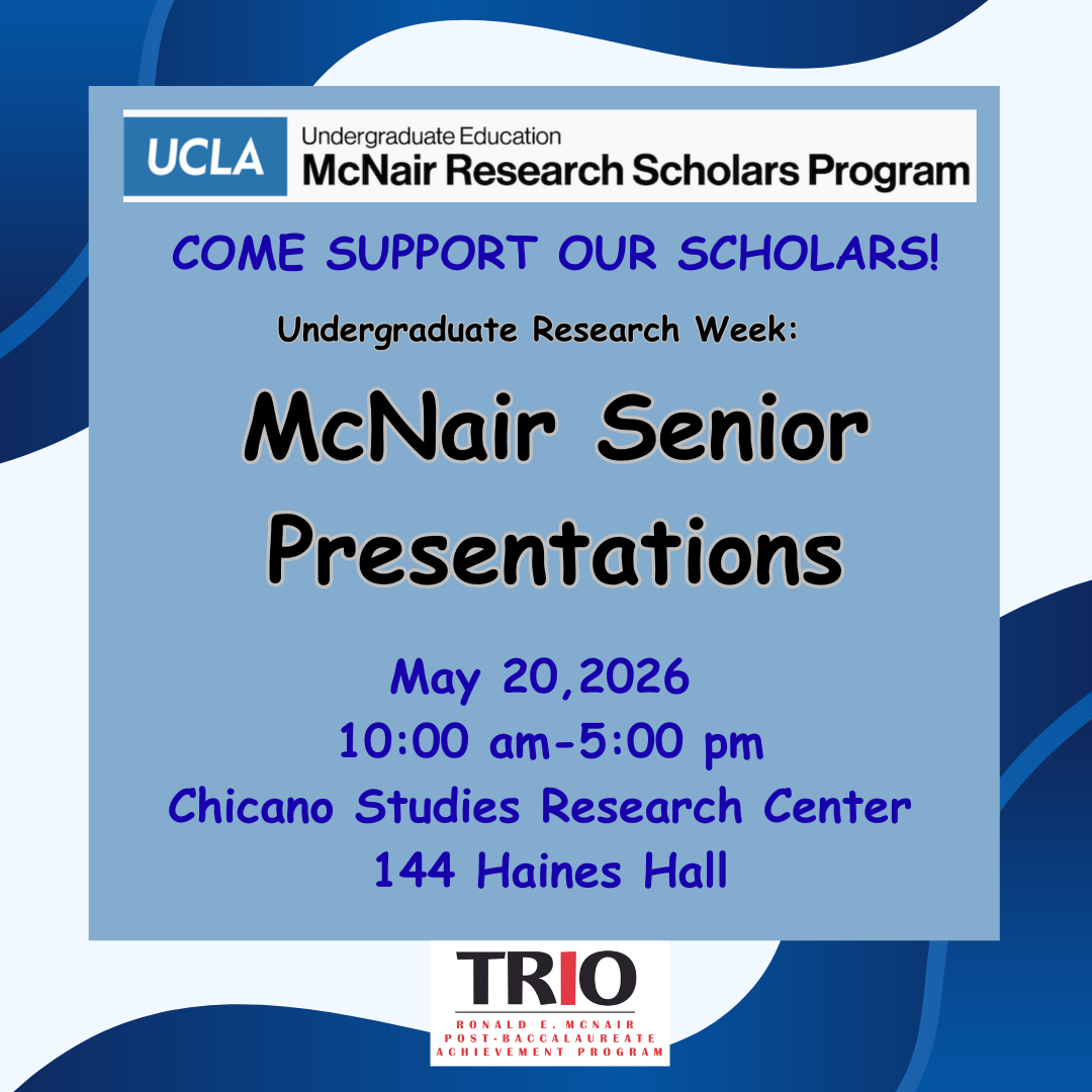 The Senior McNair Scholars will present their research topics, methods, and findings on Wednesday, May 20, 2026, from 10:00 a.m. to 5:00 p.m. The presentations will take place in person at the Chicano Studies Research Center and will also be available via Zoom.